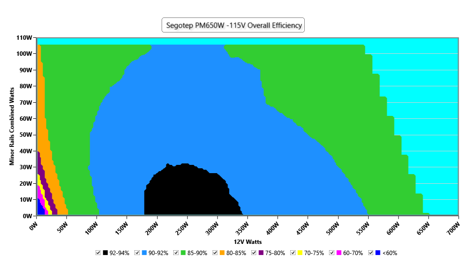 This graph depicts the PSU`s efficiency throughout its entire operational range. For the generation of the efficiency and noise graphs we set our loaders to auto mode through our custom-made software before trying thousands of possible load combinations