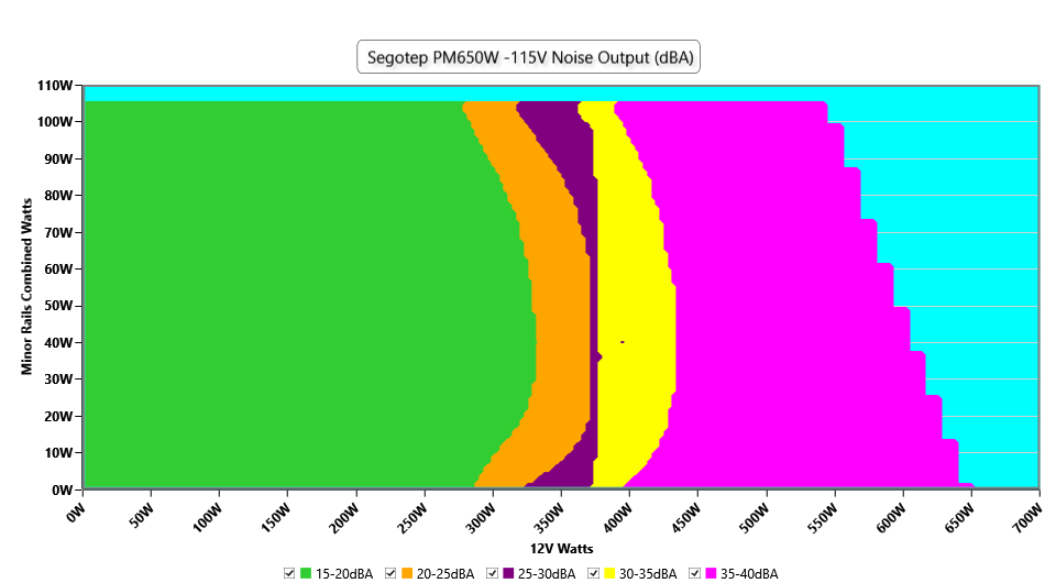 The PSU`s noise in its entire operational range and under 30-32 °C ambient is depicted in this graph. The X axis represents the load on the +12V rail(s) while the Y axis is the load on the minor rails