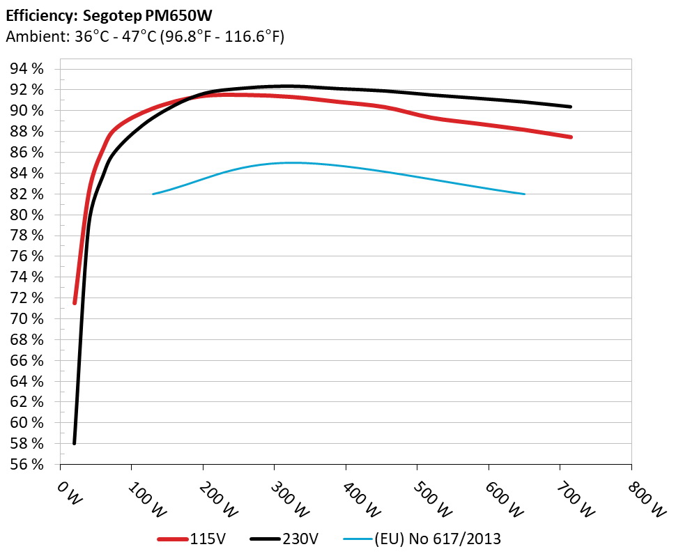 The PSU`s efficiency under high ambient temperatures with 115V and 230V input. For this graph the results of the 10-110% load regulation table are used