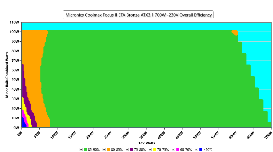 This graph depicts the PSU`s efficiency throughout its entire operational range. For the generation of the efficiency and noise graphs we set our loaders to auto mode through our custom-made software before trying thousands of possible load combinations