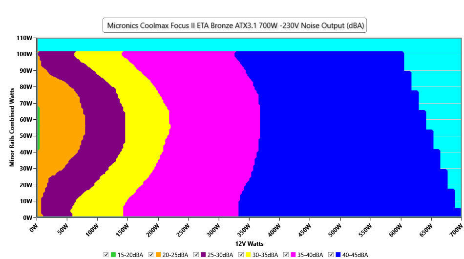 The PSU`s noise in its entire operational range and under 30-32 °C ambient is depicted in this graph. The X axis represents the load on the +12V rail(s) while the Y axis is the load on the minor rails