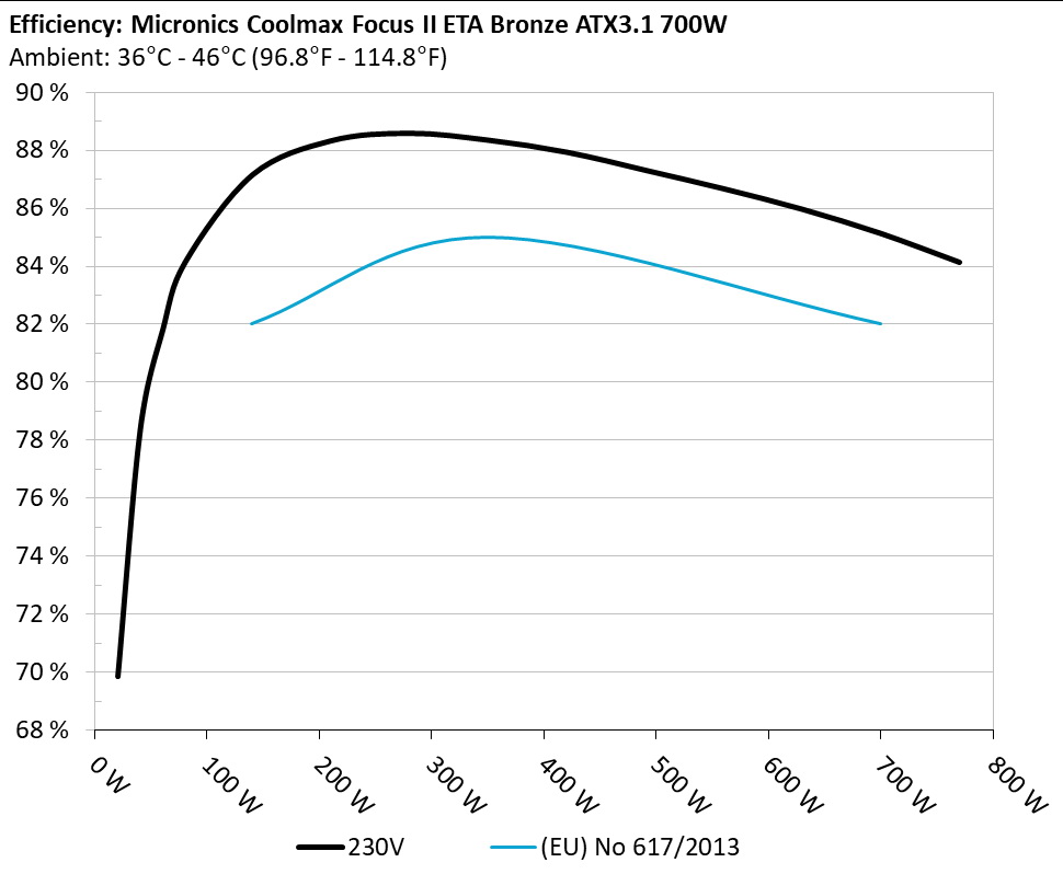 The PSU`s efficiency under high ambient temperatures with 115V and 230V input. For this graph the results of the 10-110% load regulation table are used