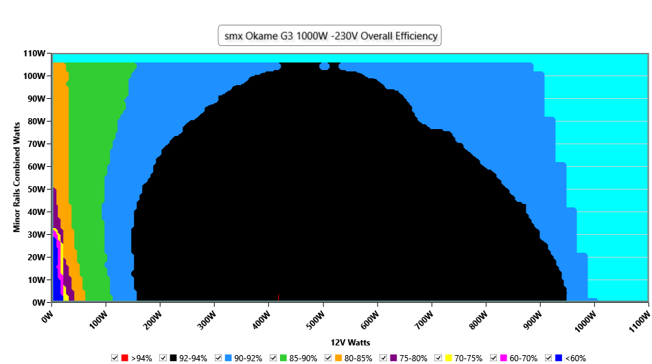 This graph depicts the PSU`s efficiency throughout its entire operational range. For the generation of the efficiency and noise graphs we set our loaders to auto mode through our custom-made software before trying thousands of possible load combinations