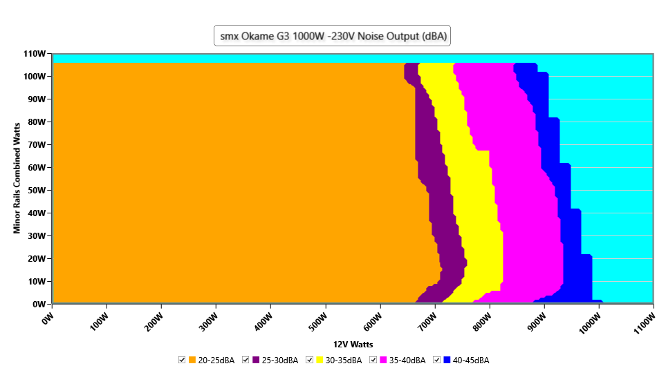 The PSU`s noise in its entire operational range and under 30-32 °C ambient is depicted in this graph. The X axis represents the load on the +12V rail(s) while the Y axis is the load on the minor rails