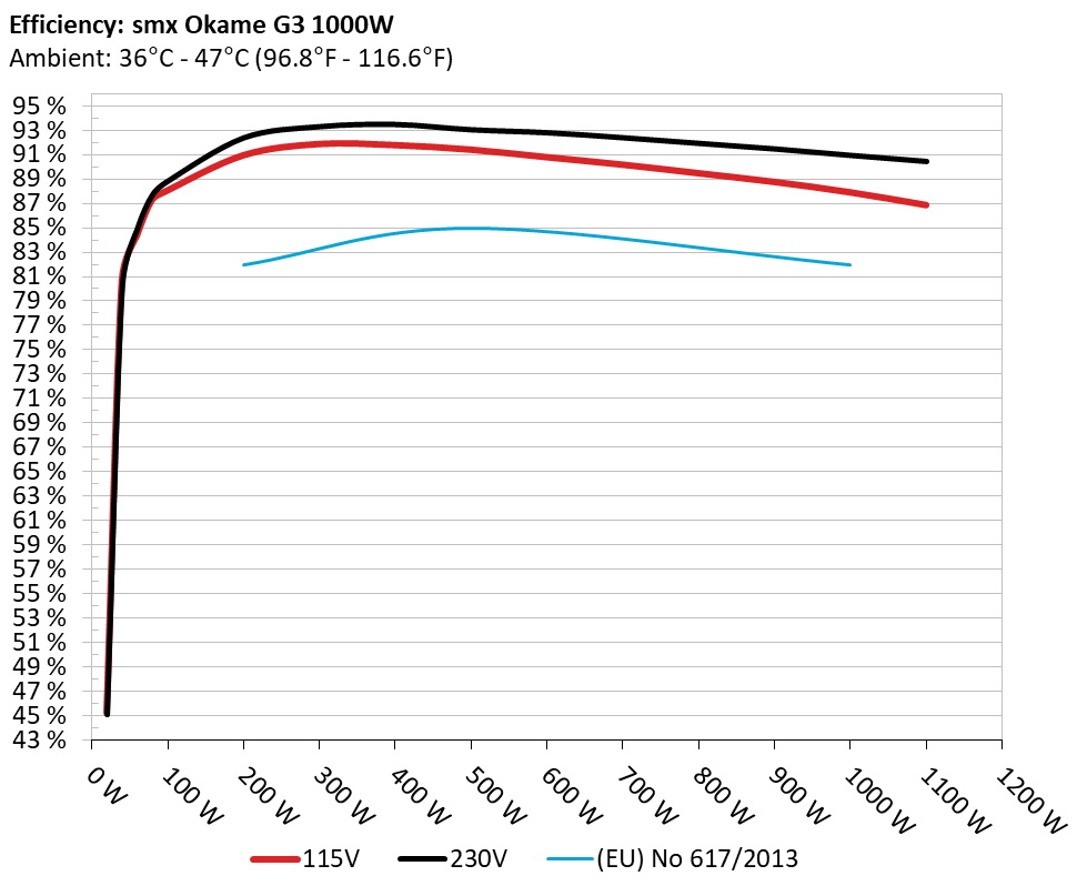 The PSU`s efficiency under high ambient temperatures with 115V and 230V input. For this graph the results of the 10-110% load regulation table are used