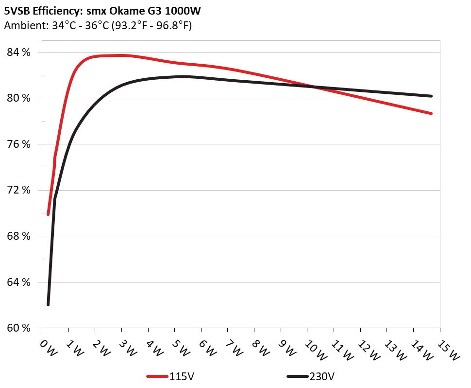 This graph depicts the efficiency levels of the 5VSB rail with 115V and 230V input