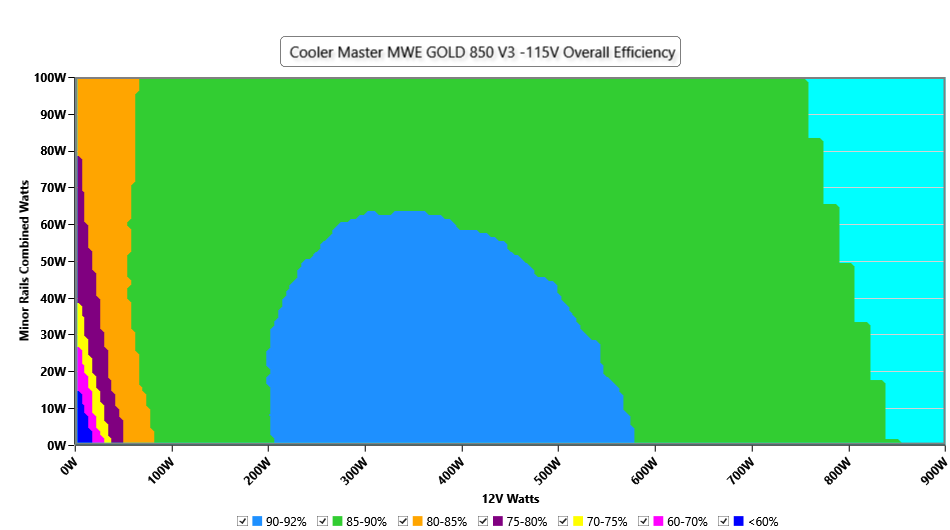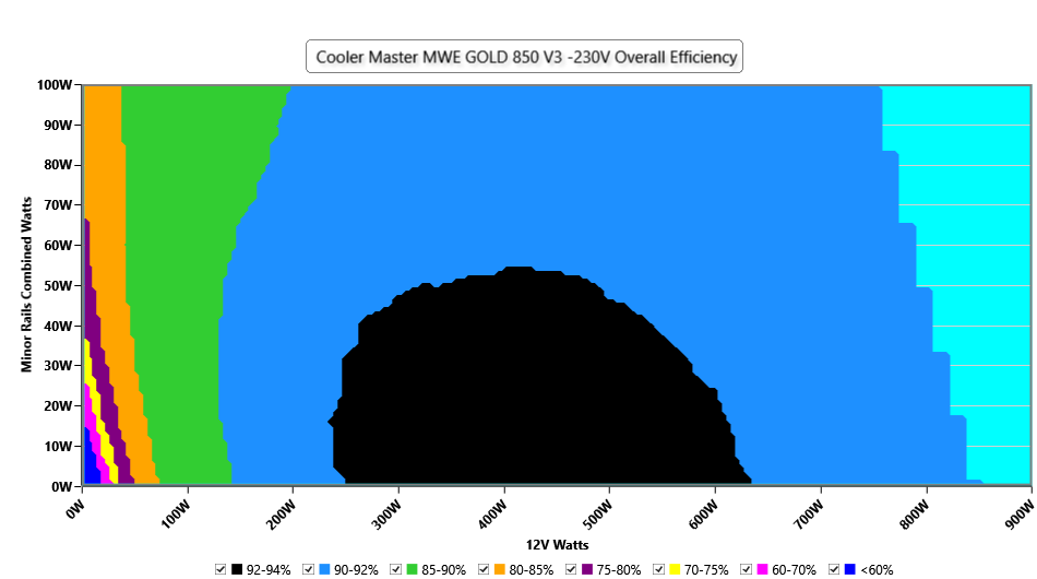 This graph depicts the PSU`s efficiency throughout its entire operational range. For the generation of the efficiency and noise graphs we set our loaders to auto mode through our custom-made software before trying thousands of possible load combinations