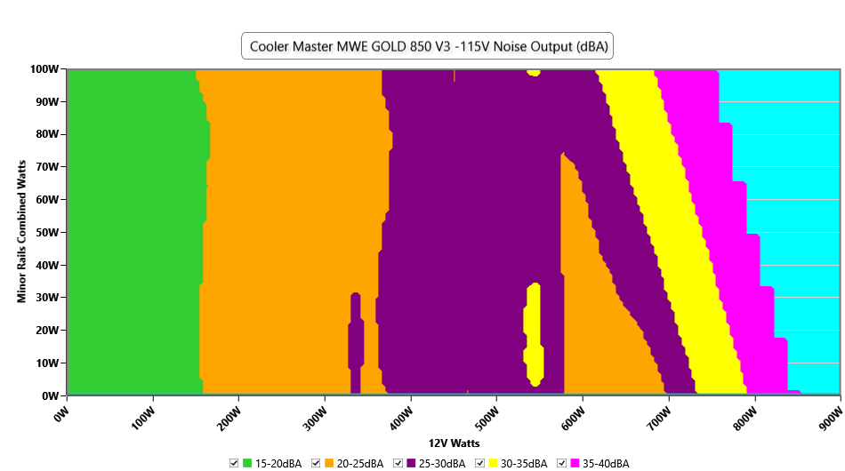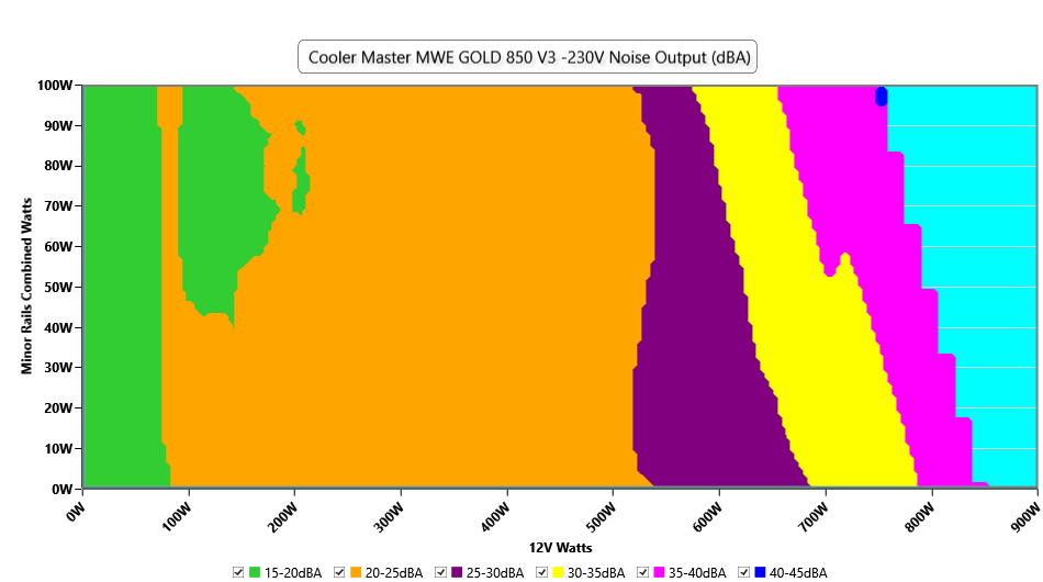 The PSU`s noise in its entire operational range and under 30-32 °C ambient is depicted in this graph. The X axis represents the load on the +12V rail(s) while the Y axis is the load on the minor rails