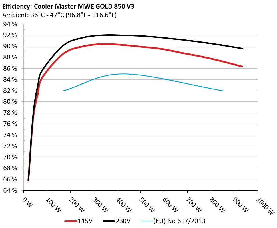 The PSU`s efficiency under high ambient temperatures with 115V and 230V input. For this graph the results of the 10-110% load regulation table are used