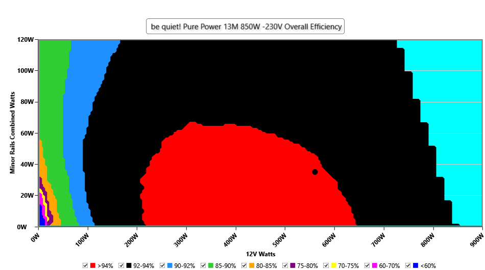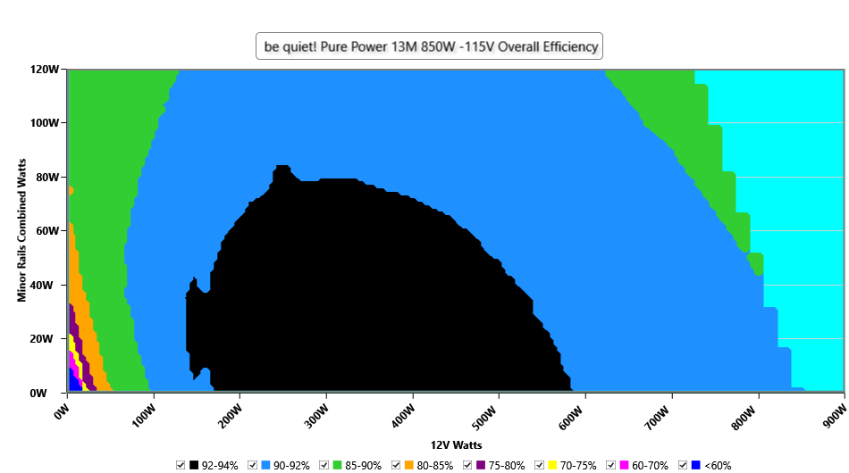 This graph depicts the PSU`s efficiency throughout its entire operational range. For the generation of the efficiency and noise graphs we set our loaders to auto mode through our custom-made software before trying thousands of possible load combinations