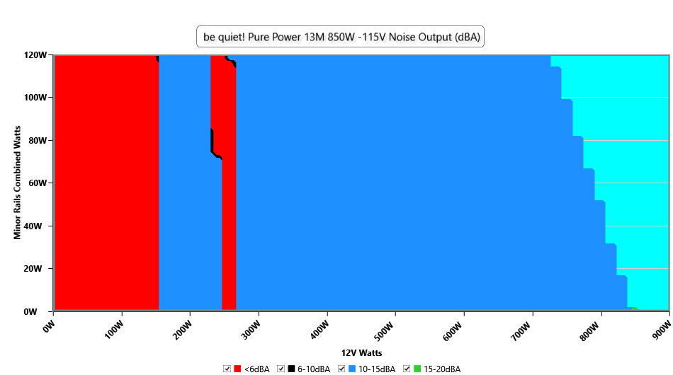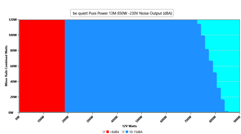 The PSU`s noise in its entire operational range and under 30-32 °C ambient is depicted in this graph. The X axis represents the load on the +12V rail(s) while the Y axis is the load on the minor rails