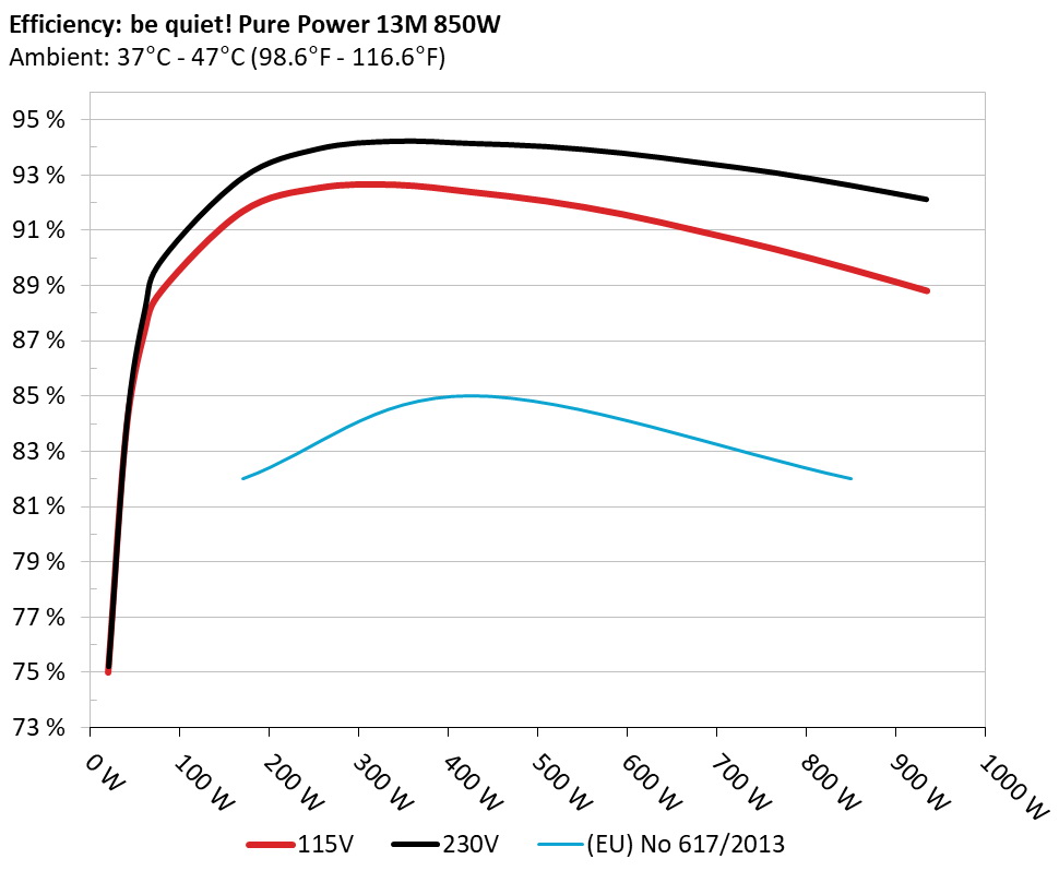 The PSU`s efficiency under high ambient temperatures with 115V and 230V input. For this graph the results of the 10-110% load regulation table are used