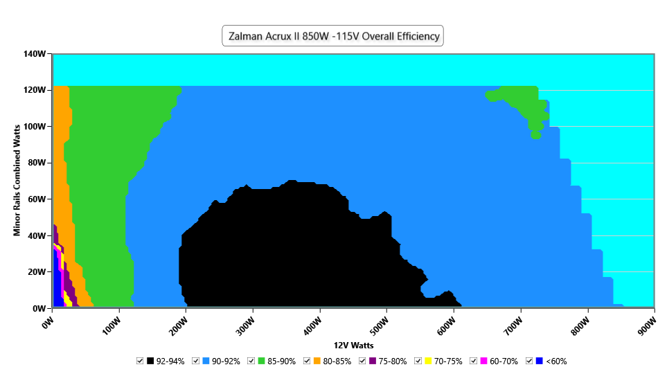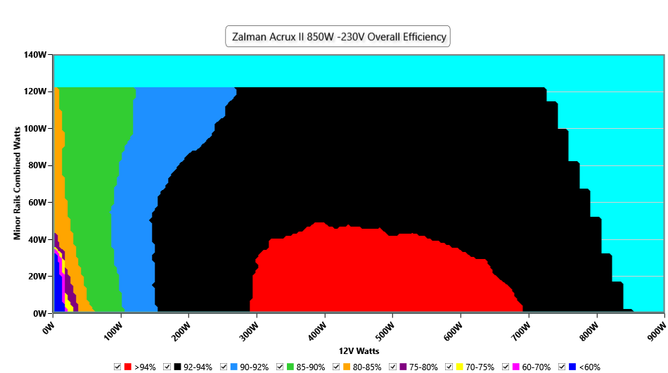 This graph depicts the PSU`s efficiency throughout its entire operational range. For the generation of the efficiency and noise graphs we set our loaders to auto mode through our custom-made software before trying thousands of possible load combinations
