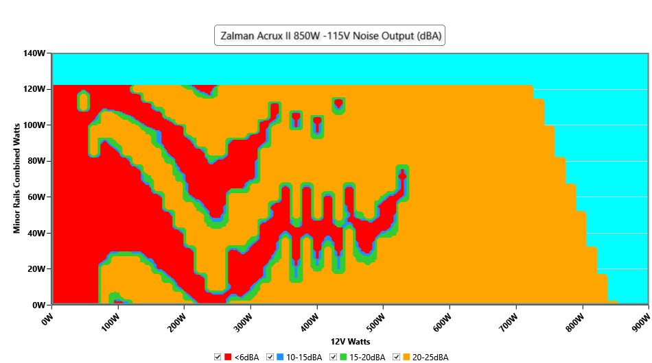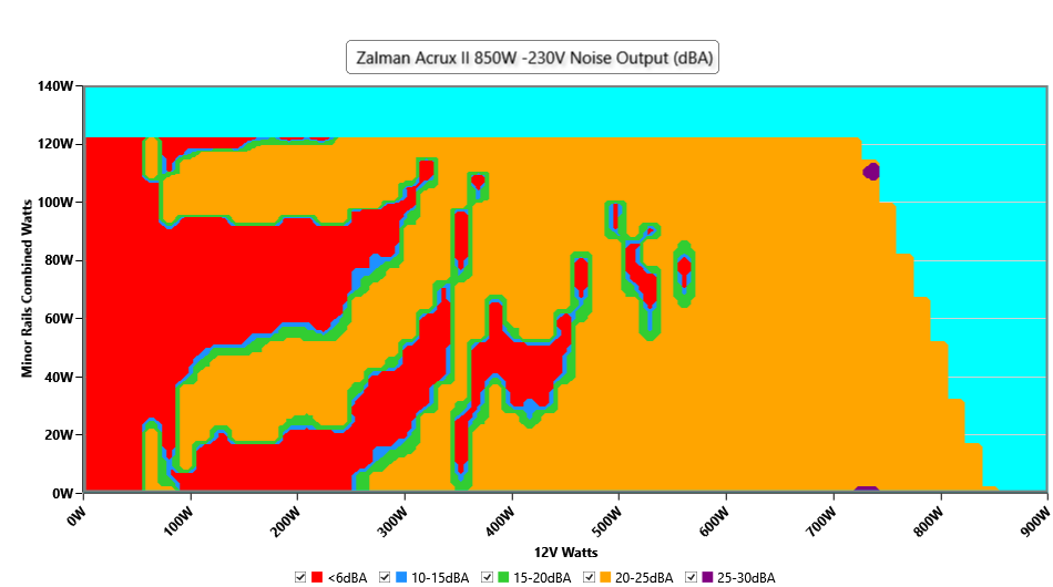The PSU`s noise in its entire operational range and under 30-32 °C ambient is depicted in this graph. The X axis represents the load on the +12V rail(s) while the Y axis is the load on the minor rails