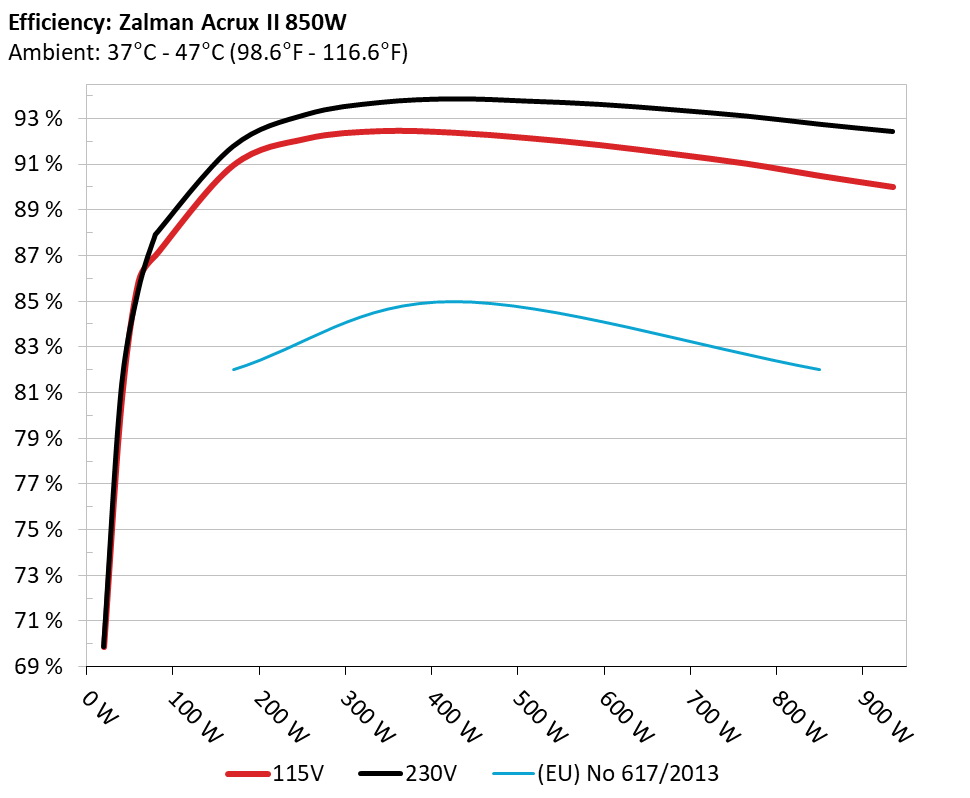 The PSU`s efficiency under high ambient temperatures with 115V and 230V input. For this graph the results of the 10-110% load regulation table are used