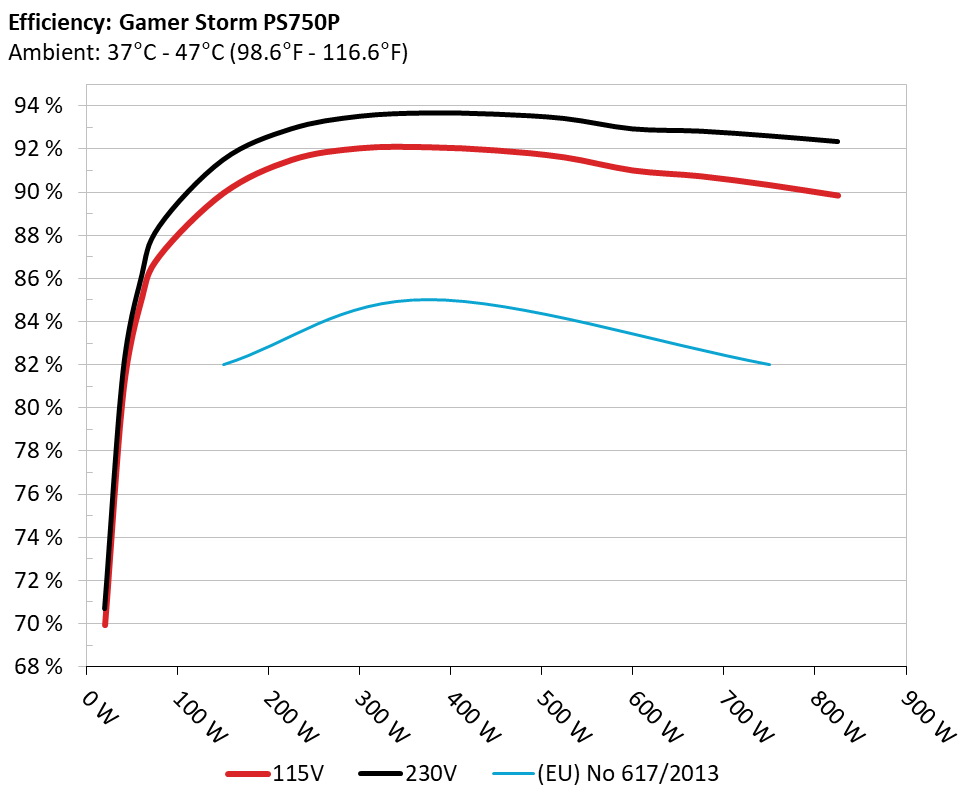 The PSU`s efficiency under high ambient temperatures with 115V and 230V input. For this graph the results of the 10-110% load regulation table are used