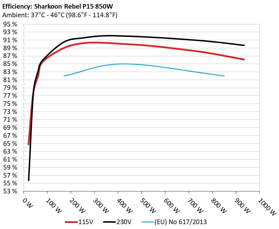 The PSU`s efficiency under high ambient temperatures with 115V and 230V input. For this graph the results of the 10-110% load regulation table are used