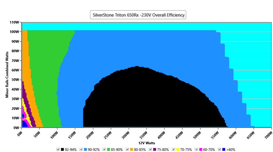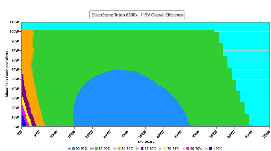 This graph depicts the PSU`s efficiency throughout its entire operational range. For the generation of the efficiency and noise graphs we set our loaders to auto mode through our custom-made software before trying thousands of possible load combinations
