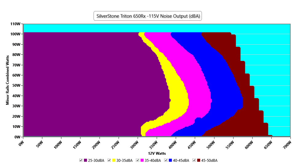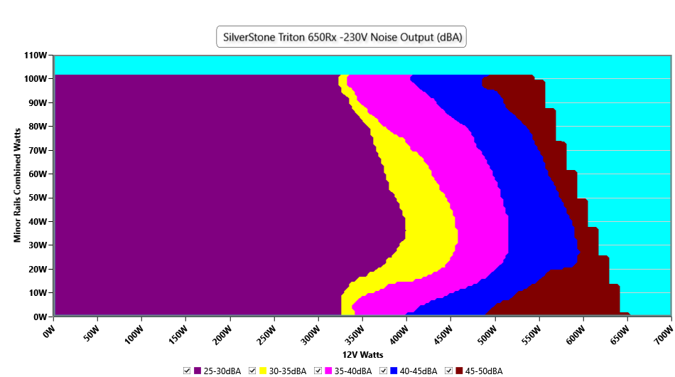 The PSU`s noise in its entire operational range and under 30-32 °C ambient is depicted in this graph. The X axis represents the load on the +12V rail(s) while the Y axis is the load on the minor rails