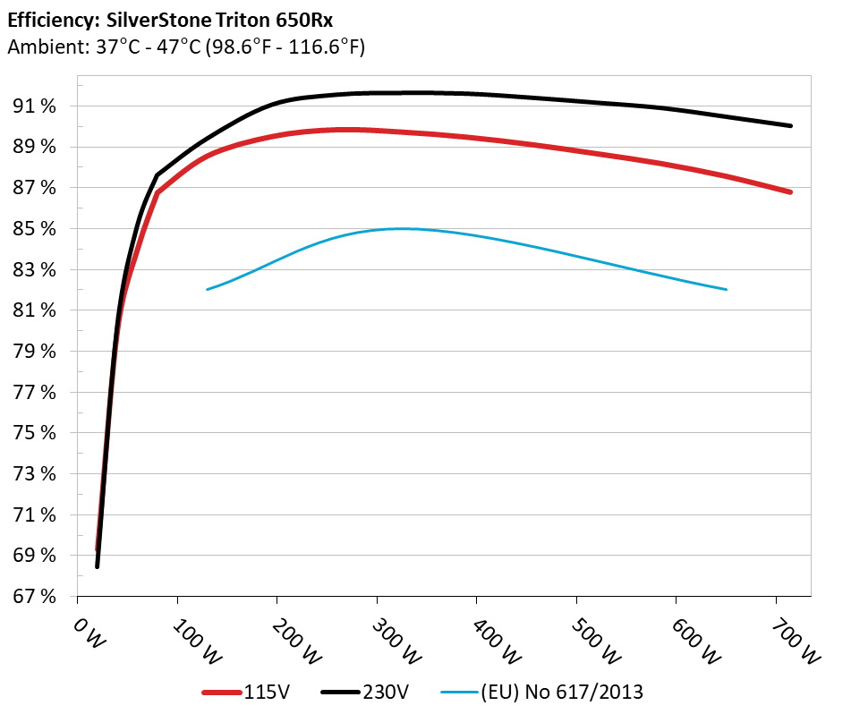 The PSU`s efficiency under high ambient temperatures with 115V and 230V input. For this graph the results of the 10-110% load regulation table are used