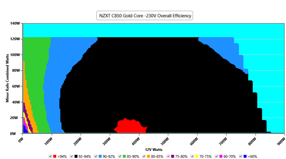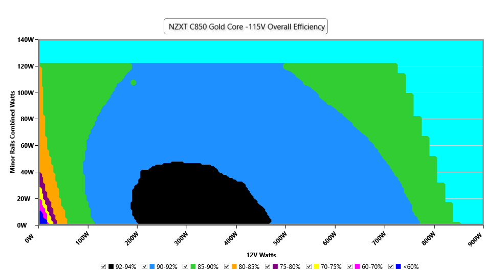 This graph depicts the PSU`s efficiency throughout its entire operational range. For the generation of the efficiency and noise graphs we set our loaders to auto mode through our custom-made software before trying thousands of possible load combinations