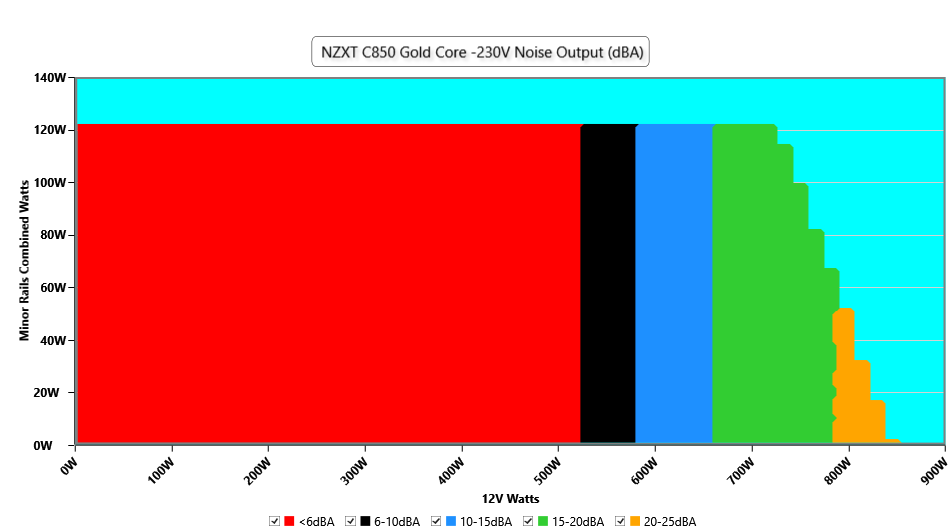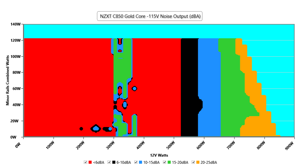 The PSU`s noise in its entire operational range and under 30-32 °C ambient is depicted in this graph. The X axis represents the load on the +12V rail(s) while the Y axis is the load on the minor rails