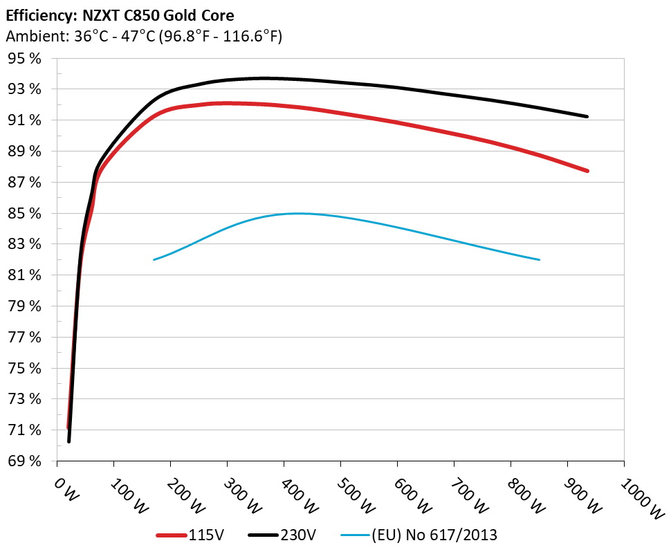 The PSU`s efficiency under high ambient temperatures with 115V and 230V input. For this graph the results of the 10-110% load regulation table are used
