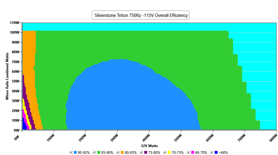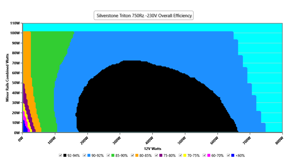 This graph depicts the PSU`s efficiency throughout its entire operational range. For the generation of the efficiency and noise graphs we set our loaders to auto mode through our custom-made software before trying thousands of possible load combinations