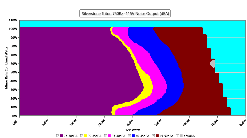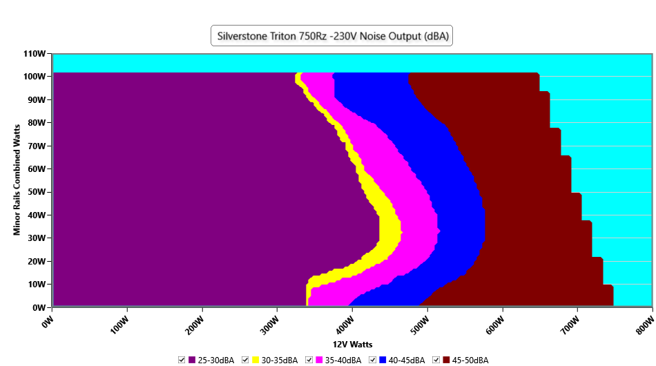 The PSU`s noise in its entire operational range and under 30-32 °C ambient is depicted in this graph. The X axis represents the load on the +12V rail(s) while the Y axis is the load on the minor rails