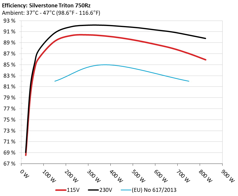 The PSU`s efficiency under high ambient temperatures with 115V and 230V input. For this graph the results of the 10-110% load regulation table are used