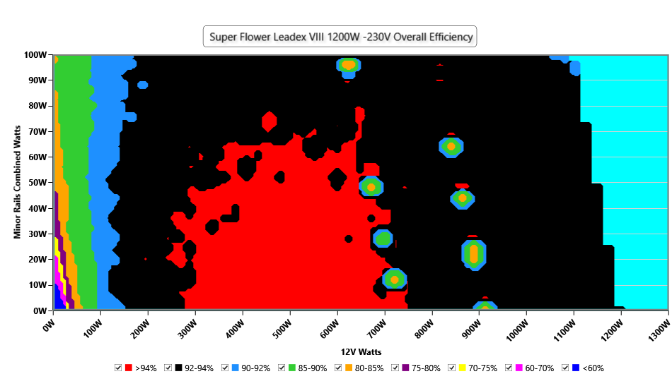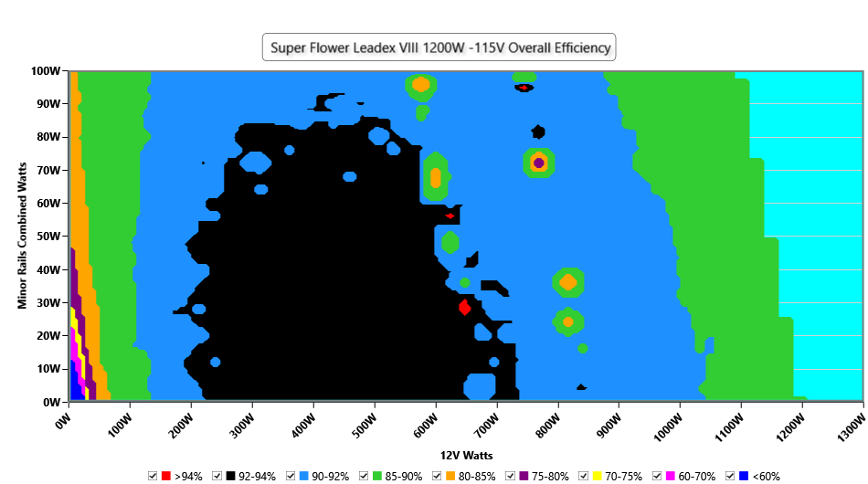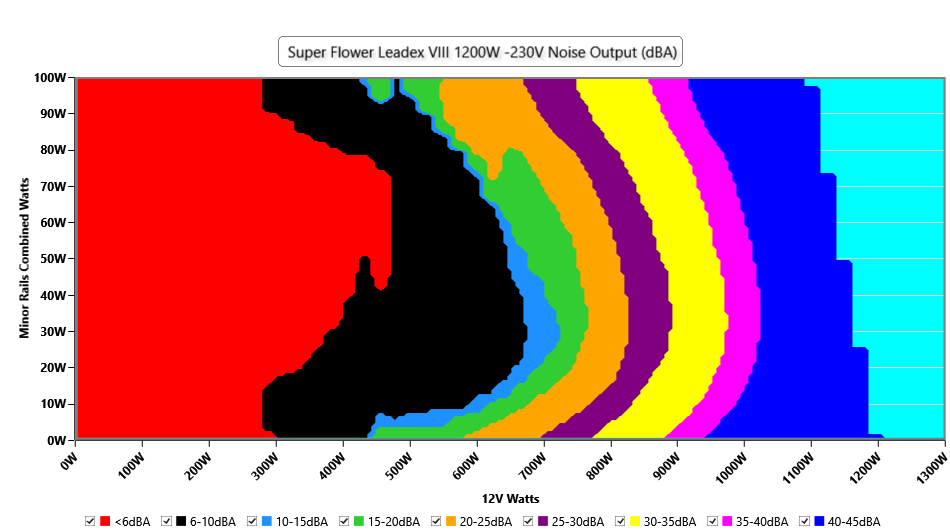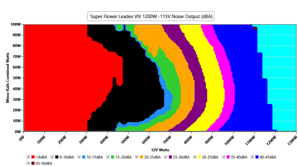 This graph depicts the PSU`s efficiency throughout its entire operational range. For the generation of the efficiency and noise graphs we set our loaders to auto mode through our custom-made software before trying thousands of possible load combinations
