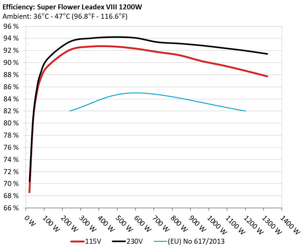 The PSU`s efficiency under high ambient temperatures with 115V and 230V input. For this graph the results of the 10-110% load regulation table are used