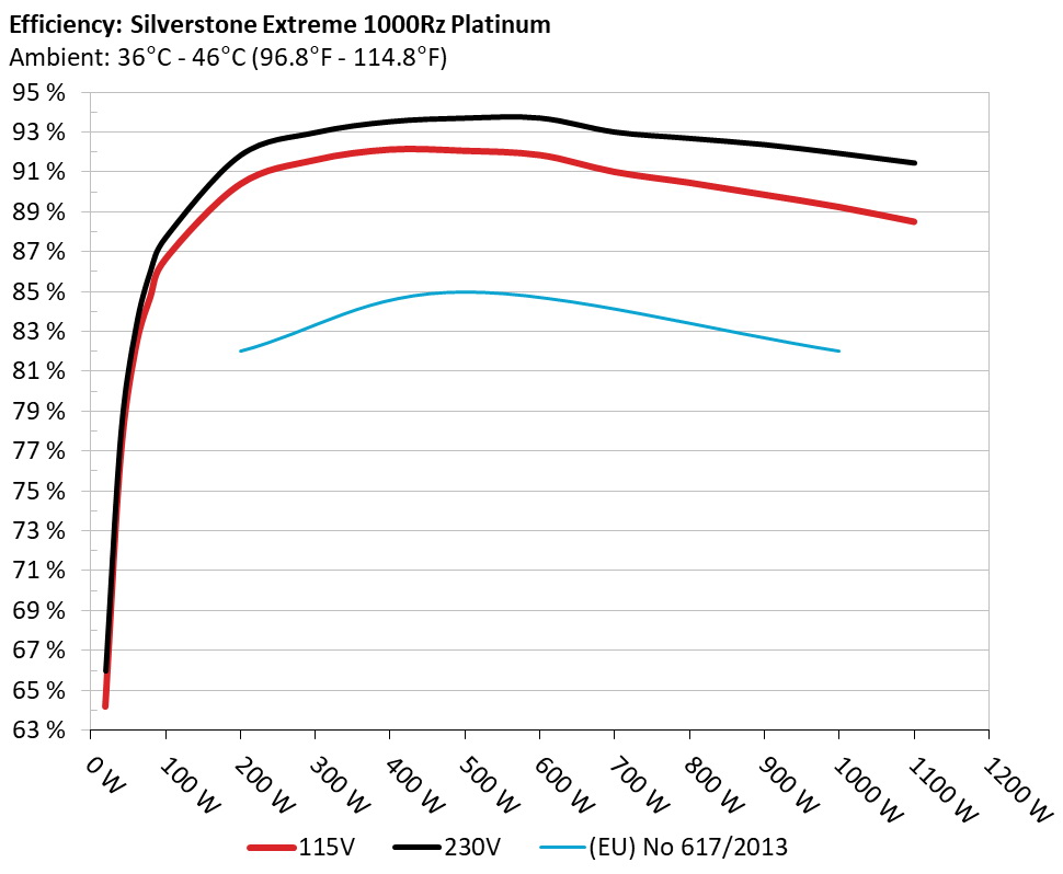 The PSU`s efficiency under high ambient temperatures with 115V and 230V input. For this graph the results of the 10-110% load regulation table are used
