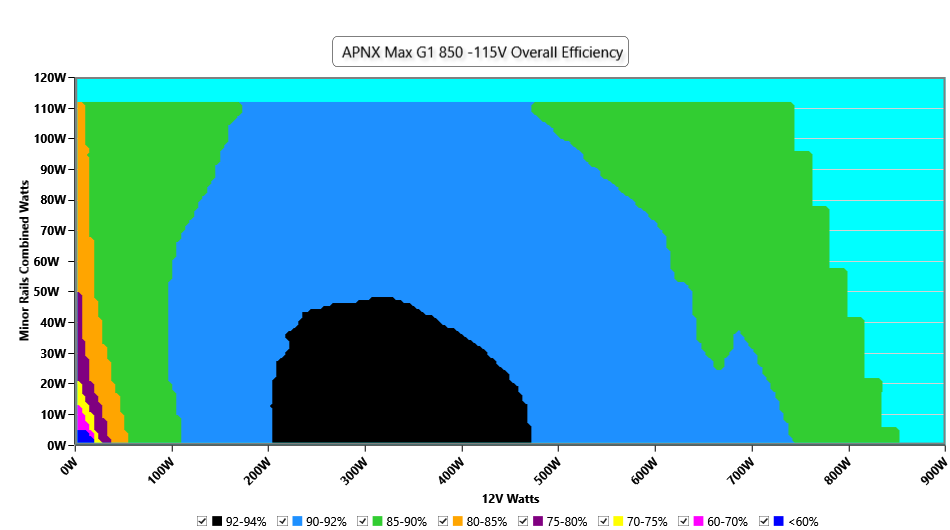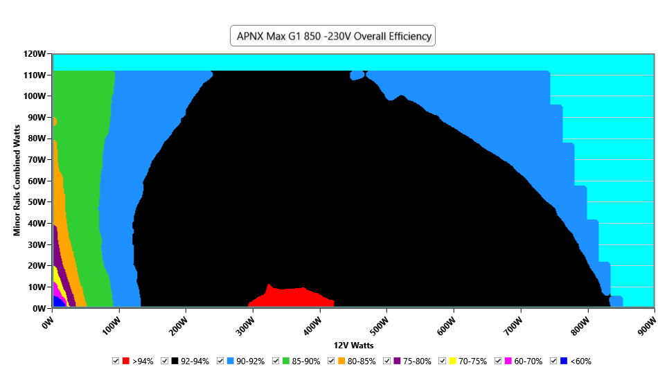 This graph depicts the PSU`s efficiency throughout its entire operational range. For the generation of the efficiency and noise graphs we set our loaders to auto mode through our custom-made software before trying thousands of possible load combinations