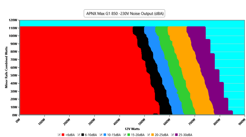 The PSU`s noise in its entire operational range and under 30-32 °C ambient is depicted in this graph. The X axis represents the load on the +12V rail(s) while the Y axis is the load on the minor rails