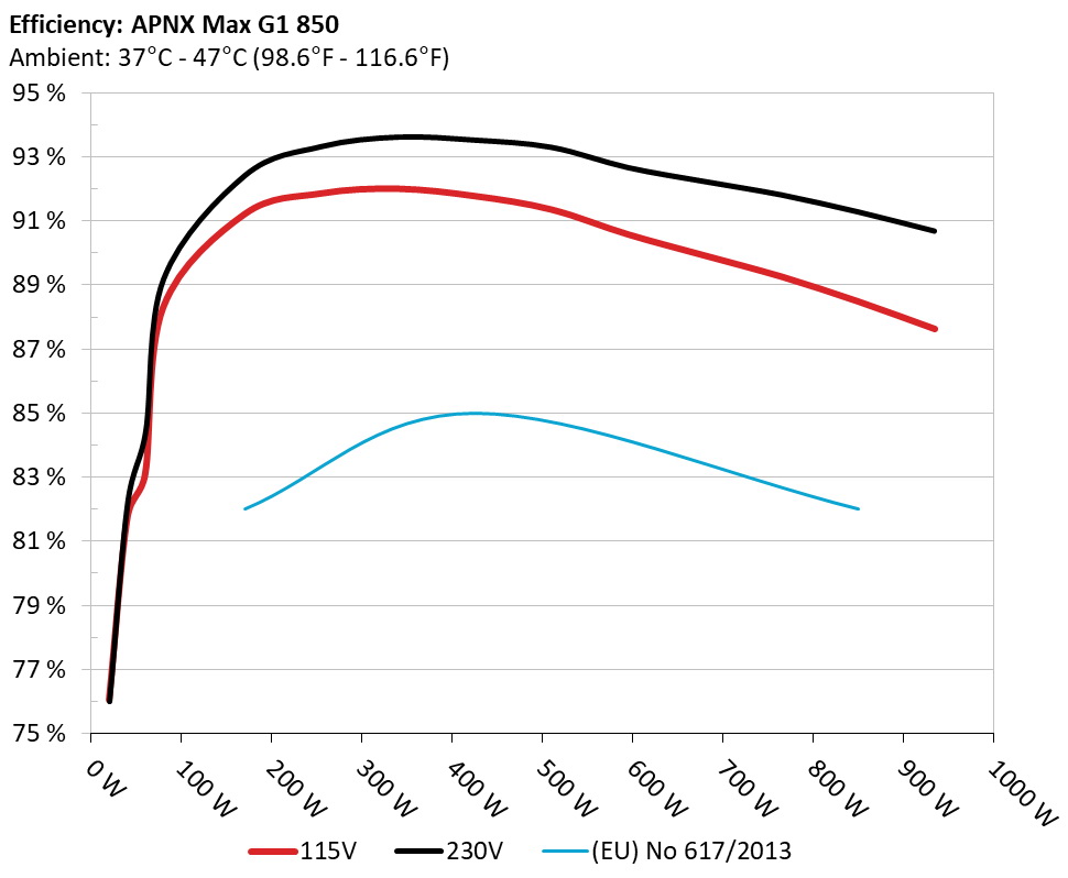 The PSU`s efficiency under high ambient temperatures with 115V and 230V input. For this graph the results of the 10-110% load regulation table are used