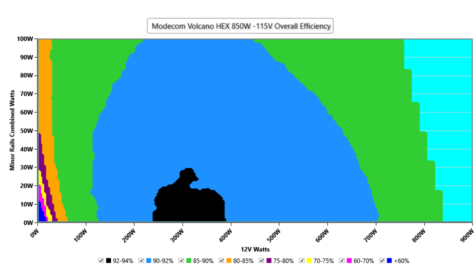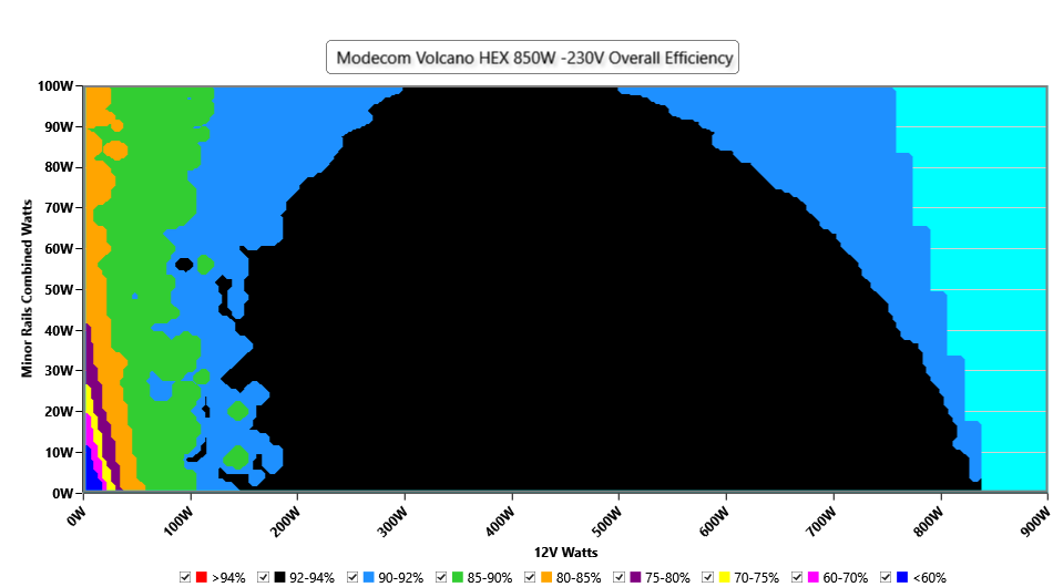 This graph depicts the PSU`s efficiency throughout its entire operational range. For the generation of the efficiency and noise graphs we set our loaders to auto mode through our custom-made software before trying thousands of possible load combinations