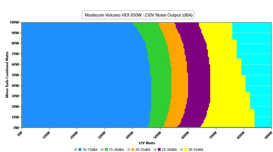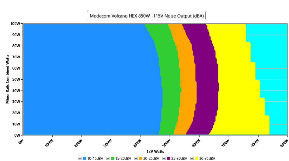 The PSU`s noise in its entire operational range and under 30-32 °C ambient is depicted in this graph. The X axis represents the load on the +12V rail(s) while the Y axis is the load on the minor rails