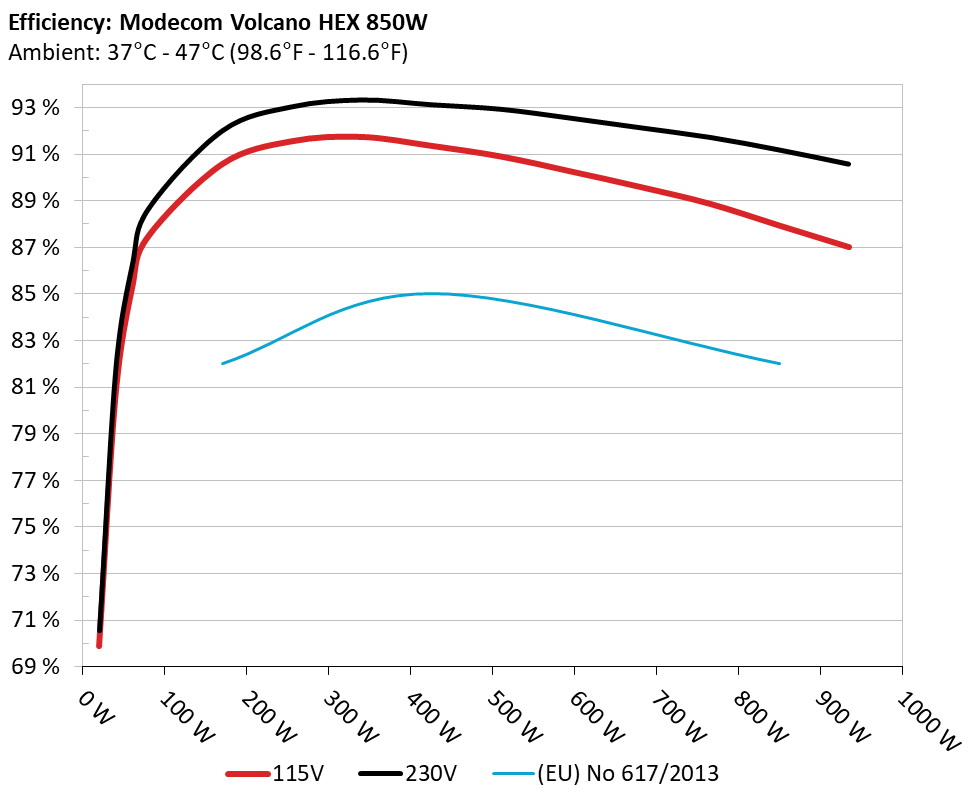 The PSU`s efficiency under high ambient temperatures with 115V and 230V input. For this graph the results of the 10-110% load regulation table are used