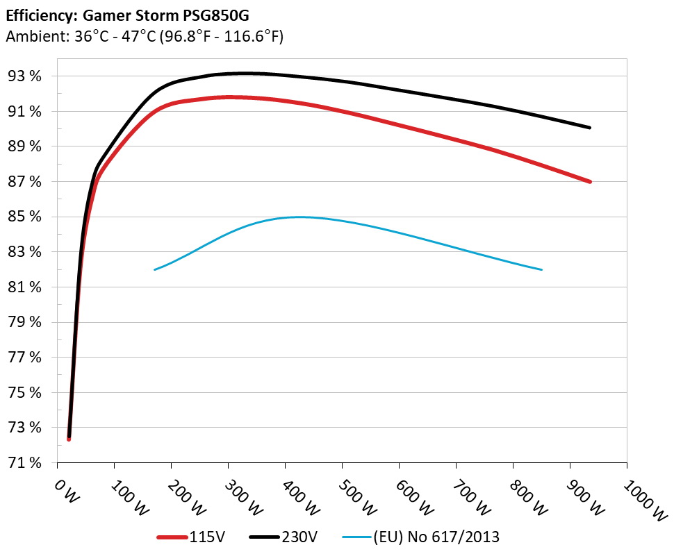 The PSU`s efficiency under high ambient temperatures with 115V and 230V input. For this graph the results of the 10-110% load regulation table are used