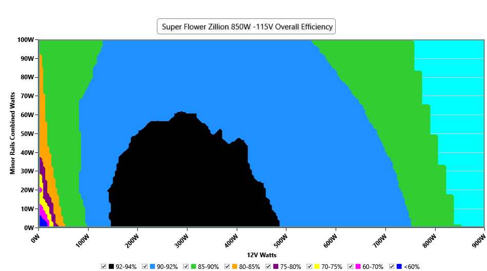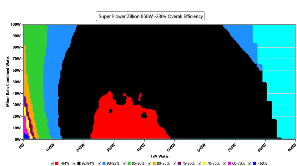 This graph depicts the PSU`s efficiency throughout its entire operational range. For the generation of the efficiency and noise graphs we set our loaders to auto mode through our custom-made software before trying thousands of possible load combinations