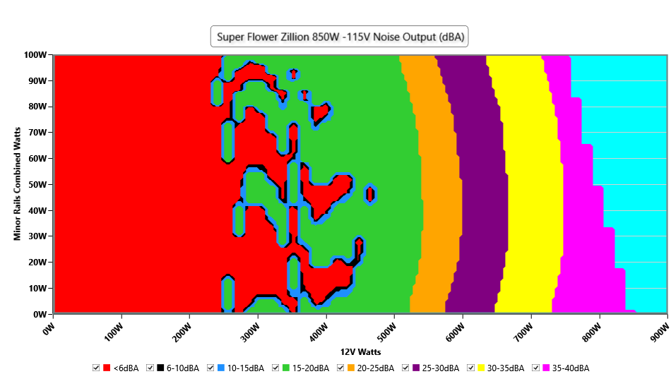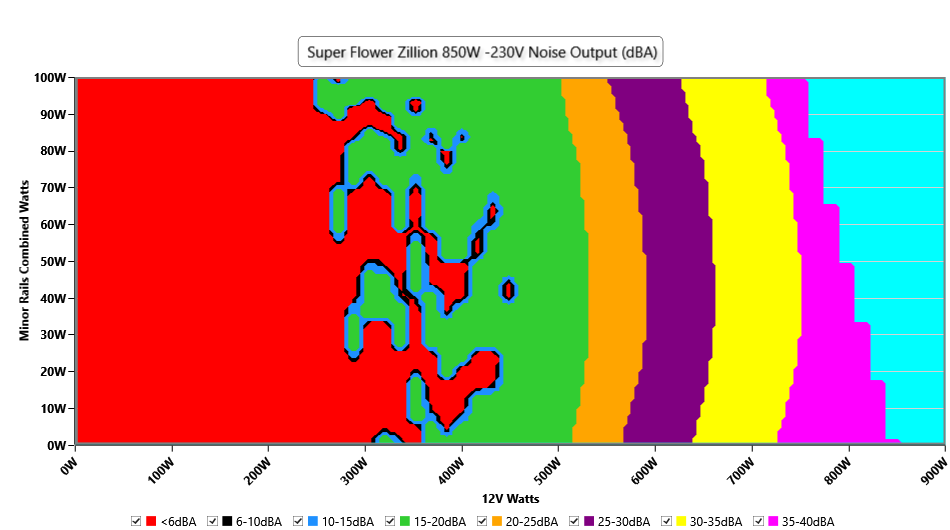 The PSU`s noise in its entire operational range and under 30-32 °C ambient is depicted in this graph. The X axis represents the load on the +12V rail(s) while the Y axis is the load on the minor rails