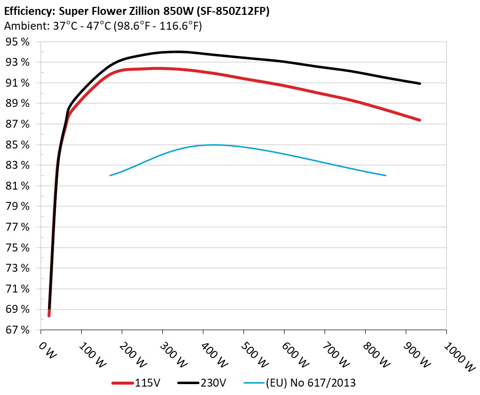 The PSU`s efficiency under high ambient temperatures with 115V and 230V input. For this graph the results of the 10-110% load regulation table are used