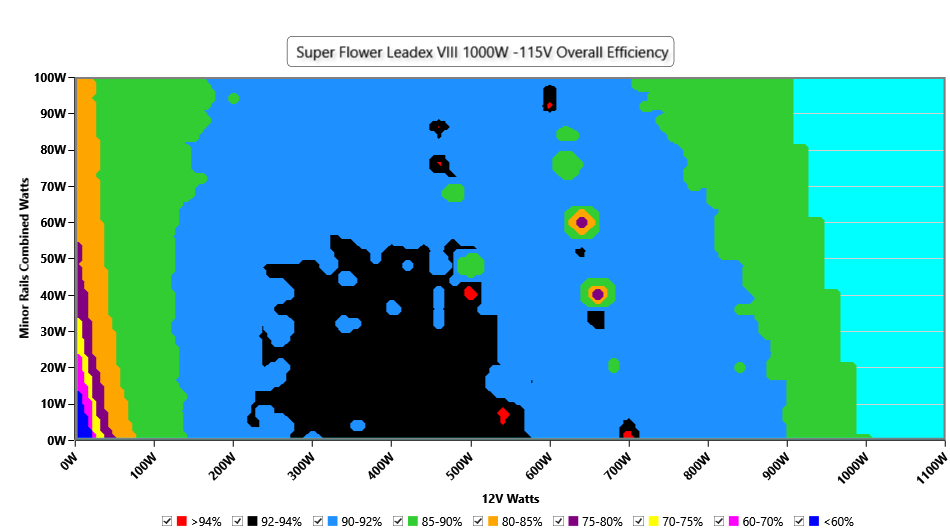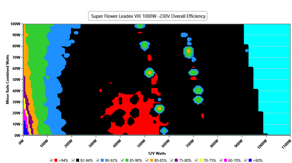This graph depicts the PSU`s efficiency throughout its entire operational range. For the generation of the efficiency and noise graphs we set our loaders to auto mode through our custom-made software before trying thousands of possible load combinations