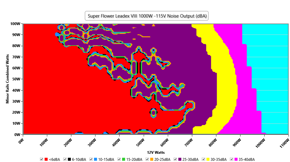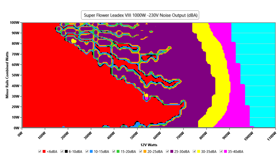 The PSU`s noise in its entire operational range and under 30-32 °C ambient is depicted in this graph. The X axis represents the load on the +12V rail(s) while the Y axis is the load on the minor rails