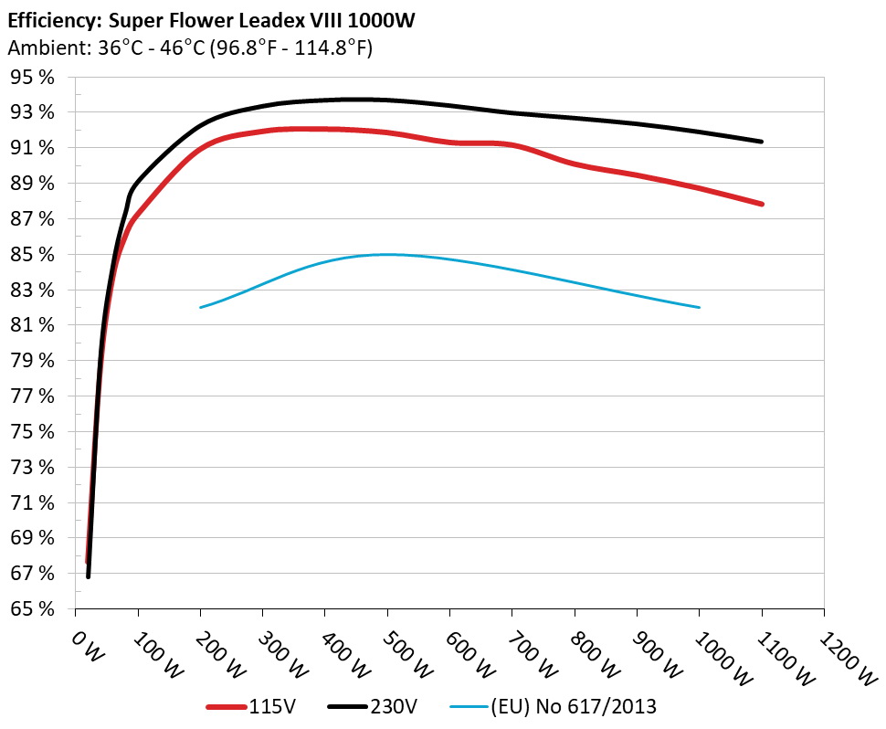 The PSU`s efficiency under high ambient temperatures with 115V and 230V input. For this graph the results of the 10-110% load regulation table are used
