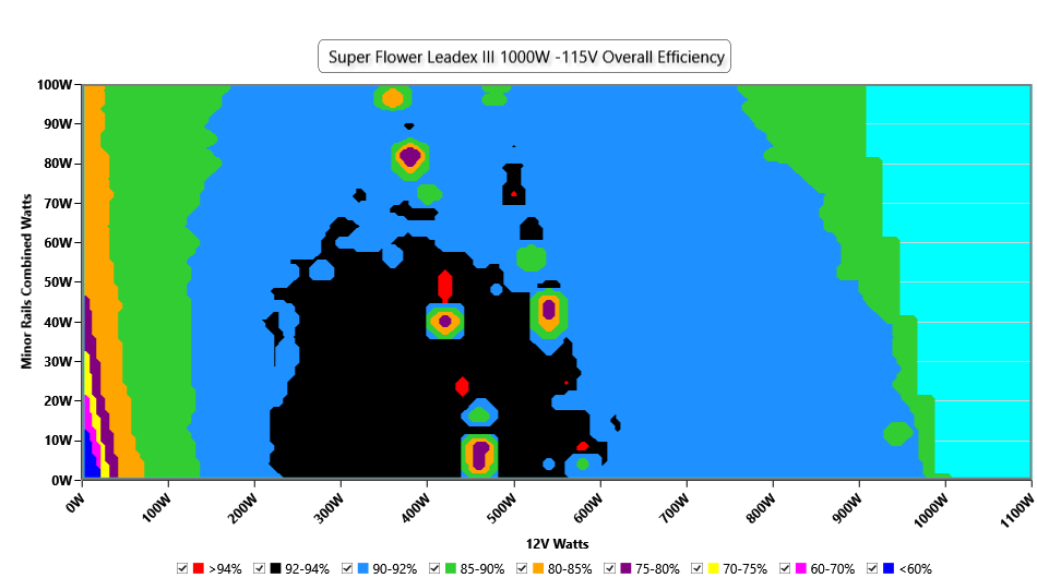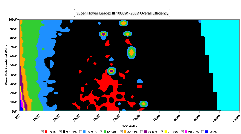 This graph depicts the PSU`s efficiency throughout its entire operational range. For the generation of the efficiency and noise graphs we set our loaders to auto mode through our custom-made software before trying thousands of possible load combinations