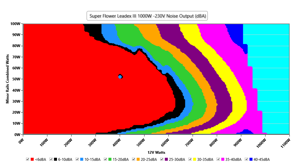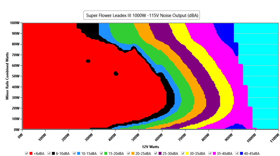 The PSU`s noise in its entire operational range and under 30-32 °C ambient is depicted in this graph. The X axis represents the load on the +12V rail(s) while the Y axis is the load on the minor rails