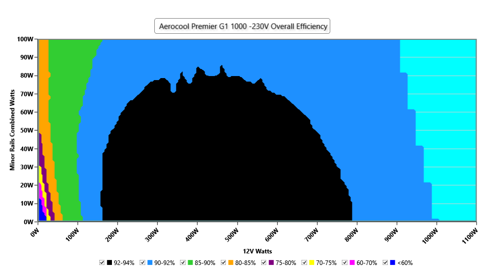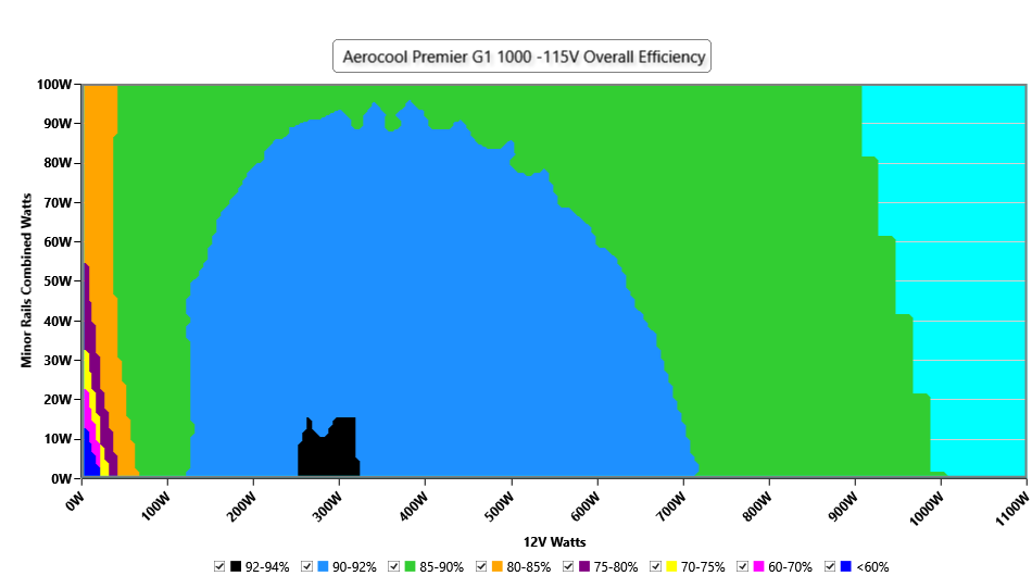 This graph depicts the PSU`s efficiency throughout its entire operational range. For the generation of the efficiency and noise graphs we set our loaders to auto mode through our custom-made software before trying thousands of possible load combinations