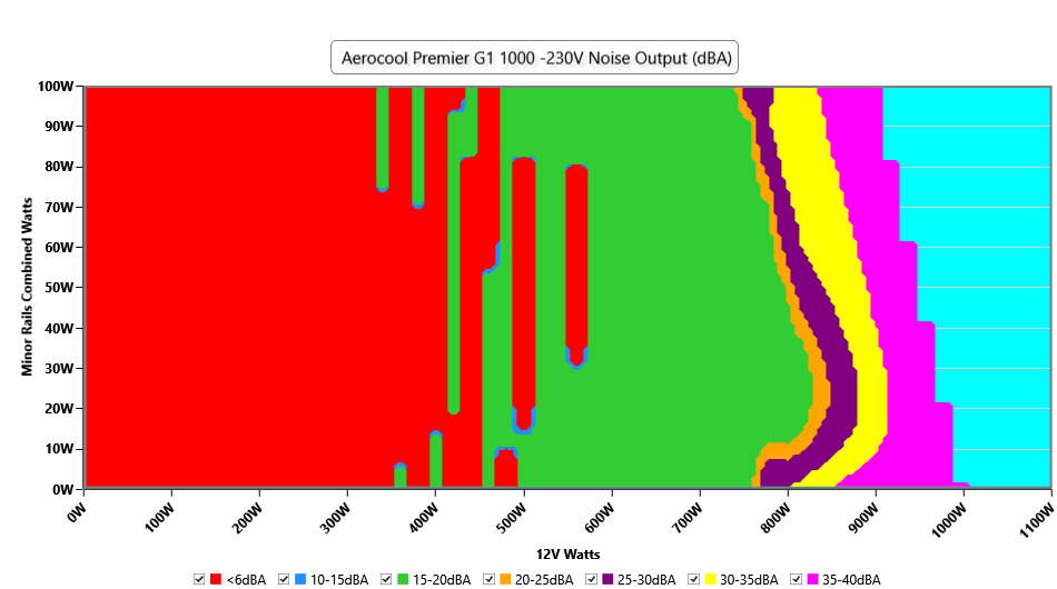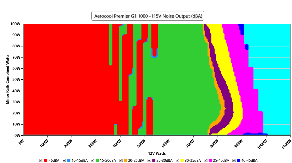 The PSU`s noise in its entire operational range and under 30-32 °C ambient is depicted in this graph. The X axis represents the load on the +12V rail(s) while the Y axis is the load on the minor rails